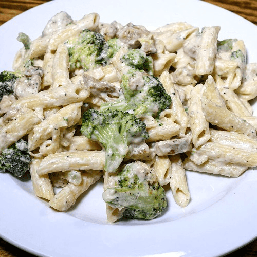 Chicken and broccoli in a creamy Alfredo sauce over fettuccine. Choice of ziti or linguini. Includes salad or soup, garlic bread, and dressing options from house to Caesar