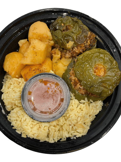 Bell peppers filled with a savory mix, accompanied by two sides from a selection including fries, Greek potatoes, or rice. Dressing options for salad include ranch and vinaigrette