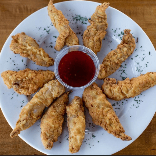 Chicken tenders offered in hot, BBQ, teriyaki, or Tommy's flavors