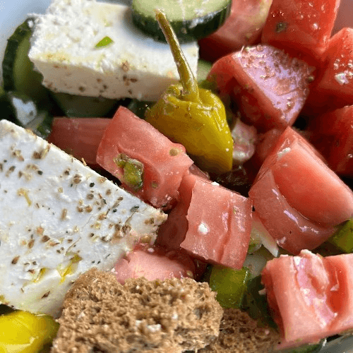 Fresh tomatoes, English cucumbers, red onion, green peppers, taco bread from Crete, imported feta from elassona, Greek black olives, oregano, extra virgin olive oil