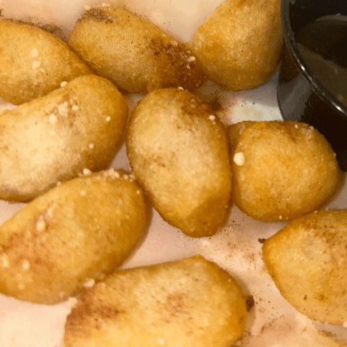 Golden, honey-soaked doughnut balls, lightly dusted with cinnamon, served with a side of chocolate and honey for dipping