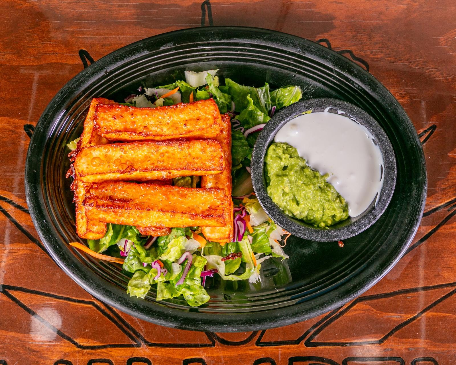 Four fried corn tortillas filled with mexican-styled mashed potatoes (cooked with onions & tomatoes). served with white rice, cotija cheese, sour cream & guacamole salad.