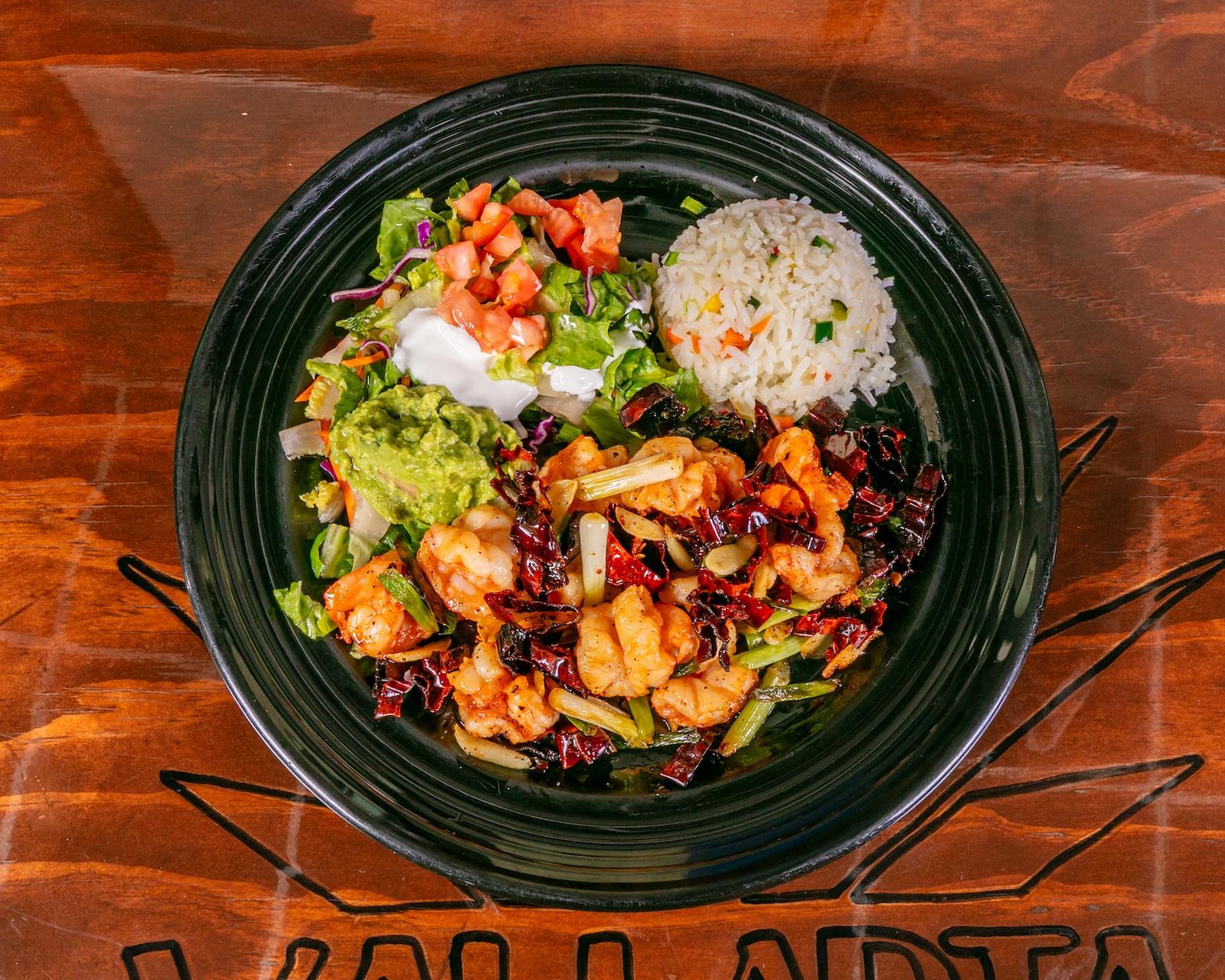 Two soft or fried flour tortillas filled with grilled shrimp, onions, and tomatoes, topped with cheese dip. Served with white rice, sour cream, and guacamole salad.