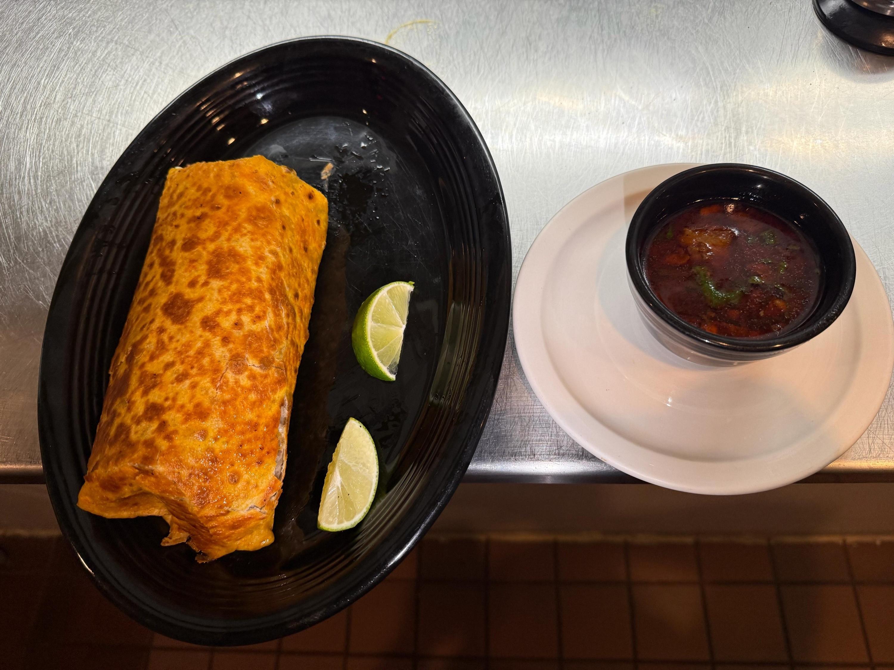12" flour tortilla filled with delicious birria, rice, beans, cilantro and onions with consomé de birria (birria sauce).
